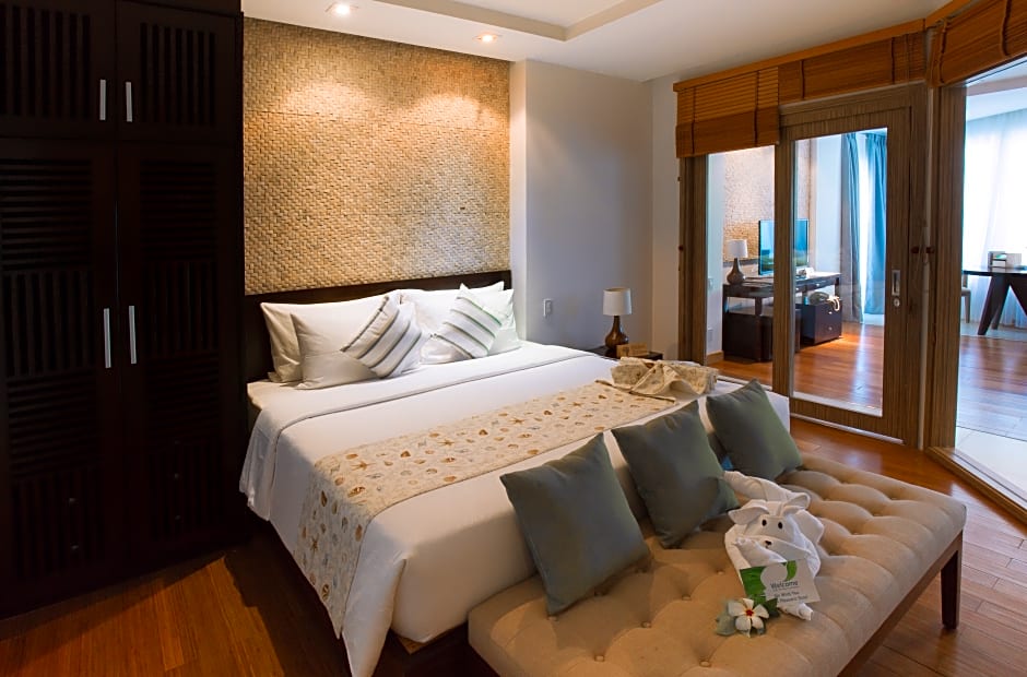 OCEAN VIEW LUXURY DUPLEX 2 BEDROOMS is 1141 square feet and includes either a king-size bed 150-183 width or 2 single beds 80-130 width plus living room, balcony, cable tv, hairdryer, ironing set, safe, bathrobes, and slippers.