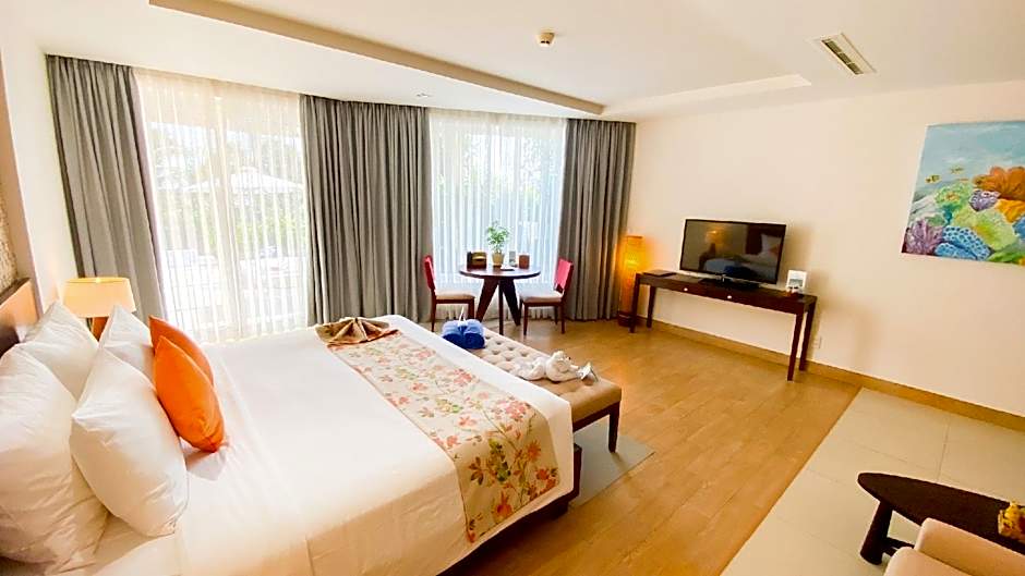Rooms enjoy beautiful views of the pool from its balcony. Comes with a flat-screen TV and personal safe. Private bathrooms include shower facilities and free toiletries.